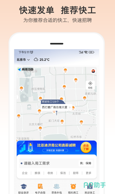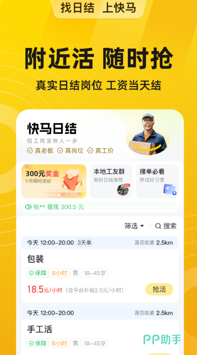 及时工作app快速找活,轻松匹配,提供现代化临工市场,全面有足够高效的解决方案。雇主快速发布用工需求与信息之后,平台会及时匹配务工人员。可在线预约还能在多方面快速对接。雇佣双方查看对方的诚信记录以及用工记录,确保双方匹配足够安全,足够高效。有较多热门岗位,比如传单派发换锁,开锁,装卸,搬运等等。