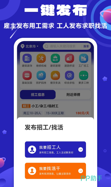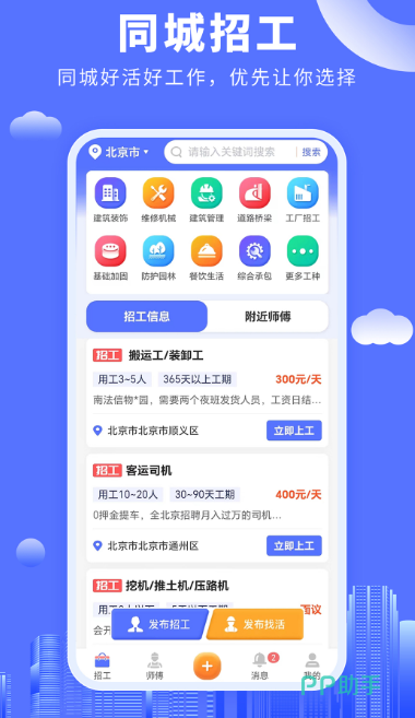 附近建筑工人接单找活app,可直接将个人需求上传到平台,无论你是找工人还是找师傅,都能快速精准匹配。涵盖多种特色内容与不同的工作种类,比如钟点工、油漆工、水电工、电焊工等作为内容信息相当齐全的应用高效的同城招工模式,好活好工人,可一网打尽。高效及时的同时足够便捷,重要的是所有内容都非常真实,每当发布信息平台都会进行全面审核。