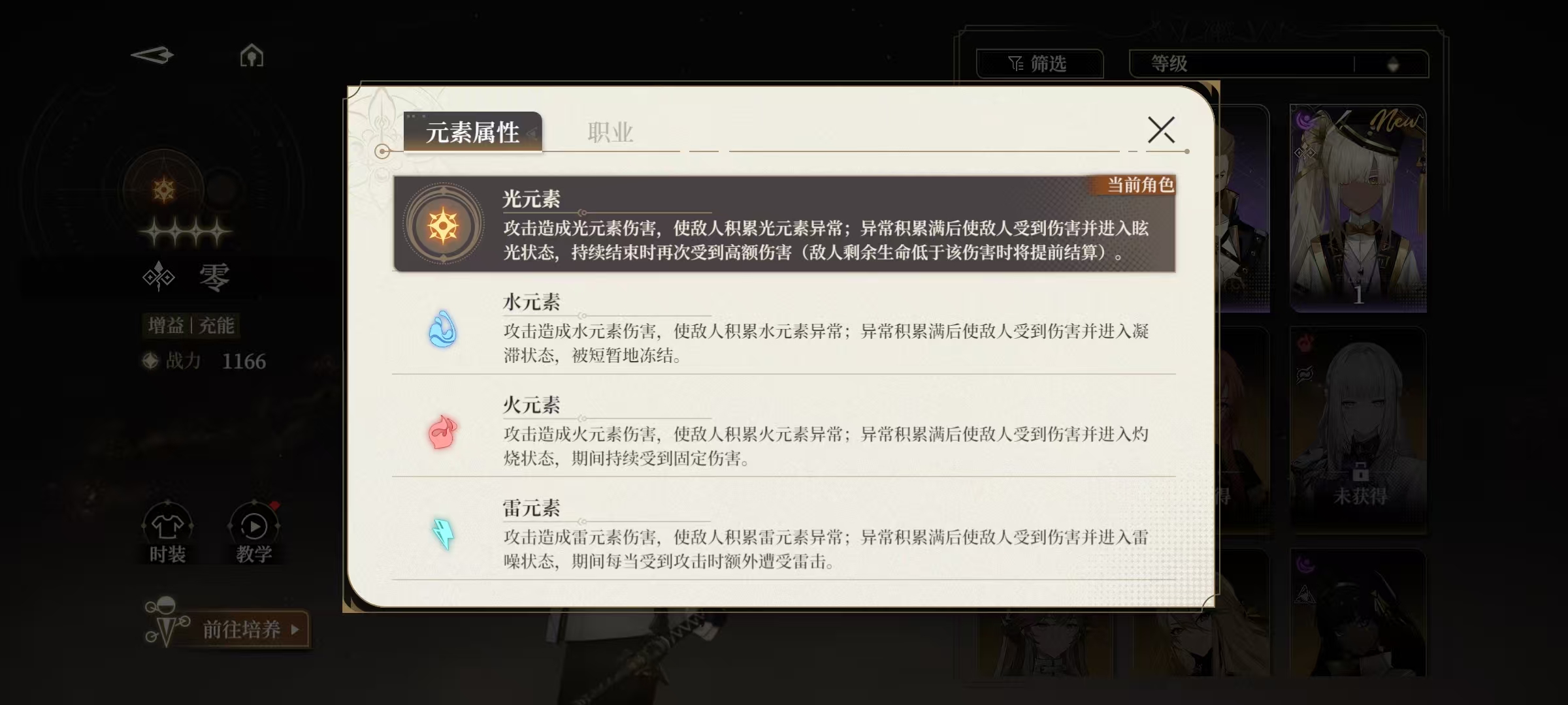 玩家所使用的所有角色都根据元素来进行划分,分别是水、火、雷、光、暗这5种元素类型,在战斗时遇到的怪物,也会有不同元素弱点,这时就需要根据对方弱点选择对应元素角色,起到克制作用后伤害会非常明显。不同元素所造成的伤害也有着独特效果加成,例如水元素,攻击造成水元素伤害,使敌人积累水元素异常,异常触发时造成伤害,使目标进入凝滞状态并造成短暂的冻结效果。