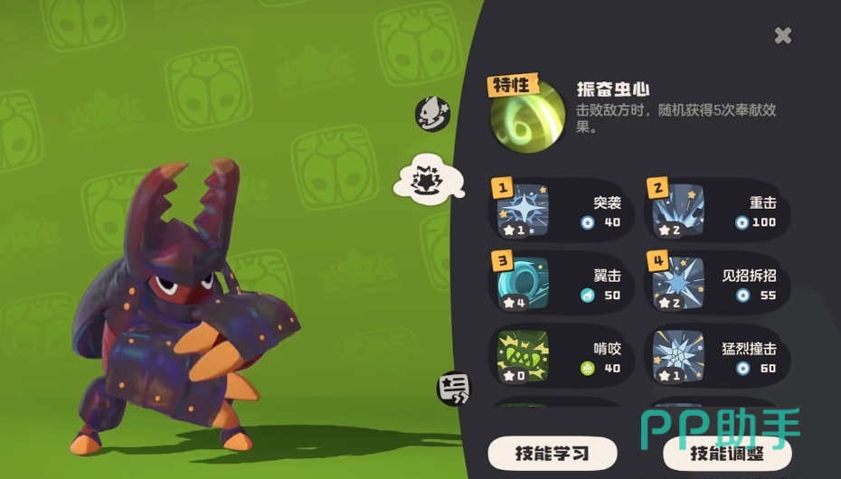 想要进一步提升铠甲虫的攻击能力,可以通过升级进化来提升技能。在它的技能【奉献】可以再次提升它的攻击能力,而且在精灵主动入场时能自动触发这个技能。如果说玩家对这个精灵技能有足够的了解,可以试着用【虫鸣】、【掩护】、【翼击】这几个技能来形成连招,再配合上攻击效果的提升效果能很好的收割对方好几个精灵。