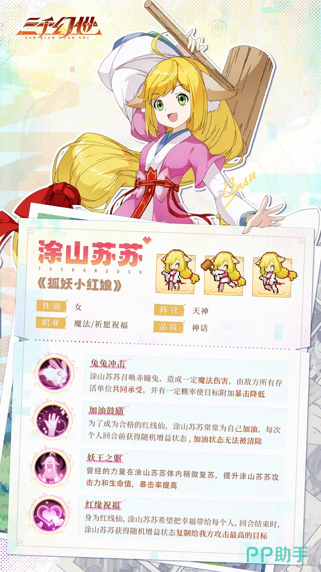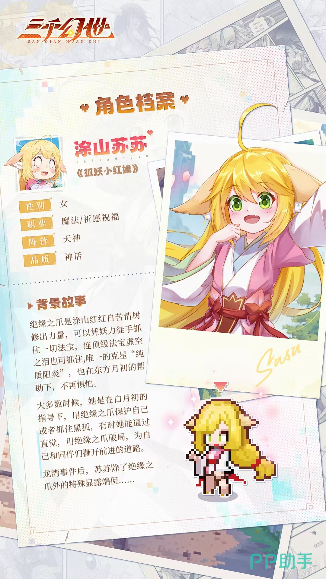 在三千幻世这款像素风格的游戏中,涂山苏苏外形是非常靓丽的一个,今天小编就来讲一下三千幻世涂山苏苏怎么样。涂山苏苏一直努力想要成为优秀的红线妖,是一个非常励志的小狐妖。前身修来了绝缘之爪,所以可以克尽天下万般法宝,虽然本身并不擅长战斗,但是在队伍中依然非常重要。