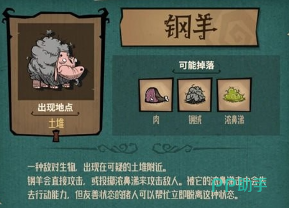 钢羊有2种不同的攻击方式,分别是远程的痰液攻击和普攻的近战,一般第一下都是朝玩家射出一发痰液弹,形成范围伤害并黏住大家,被黏住后将无法移动,制作栏和物品栏都会消失,一段时间后自动解除,并且钢羊对被黏住的目标拥有最高的攻击优先级。