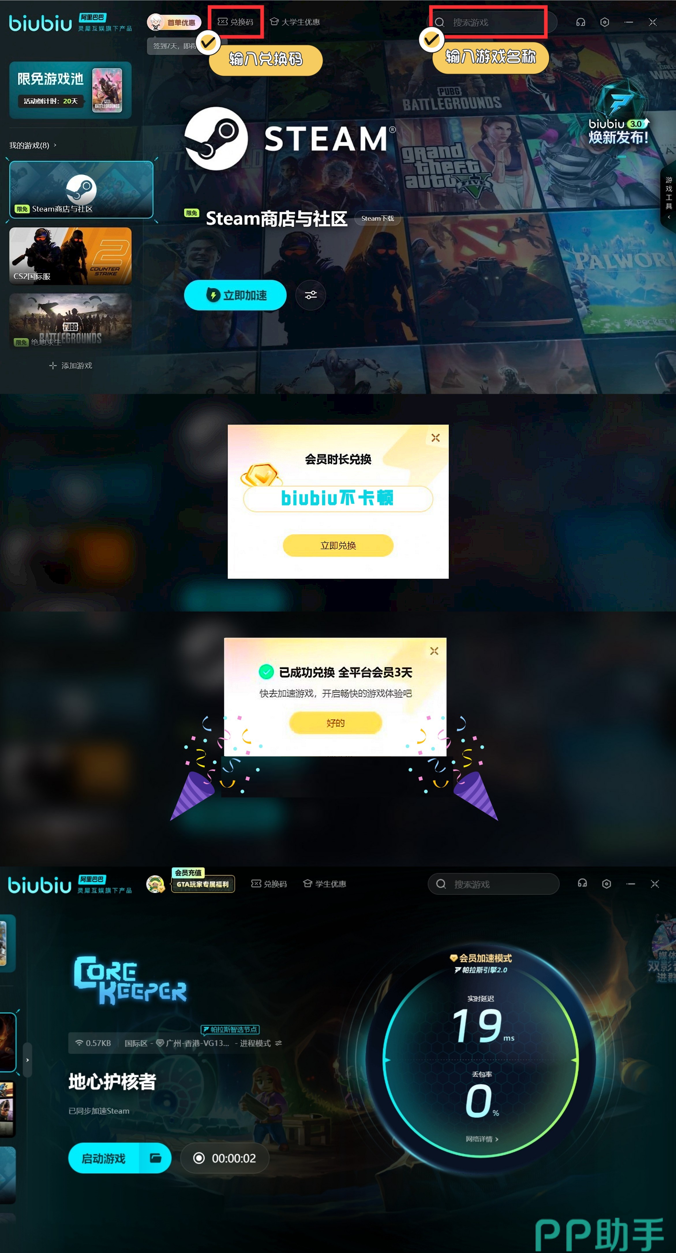 现在有新用户的福利活动:注册即可获得3小时免费加速体验。另外,不论新老朋友还能输入兑换码【biubiu不卡顿】,可额外获得72小时免费的加速时长,无需充值即可体验biubiu的加速效果。