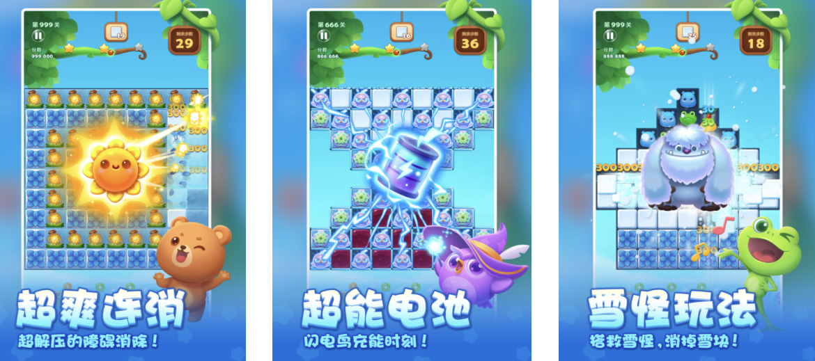 即便不联网,玩家也可以丝滑在进行消消乐玩耍。整体页面色彩以绿色和其他浅色为主,各种各样的小动物会杂乱地出现在页面当中。整体元素比较有趣,雪怪和猫头鹰以及更多元素的出现带来更多的新鲜感。为了获得更多的金币和体力,不少玩家会经营金银果树。