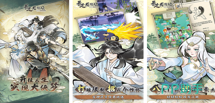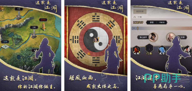 江湖元素与水墨画风相结合,玩家有一场美轮美奂的江湖体验。门派一共有八个,玩家可以轻松选择并转换。整体节奏比较缓慢,玩家也可以通过放置的方式进行。在精彩的地图方面,玩家可以点击丐帮和太极地图进行不同的玩法。武林秘籍数量多多,玩家可以通过打坐以及其他模式进行修炼。