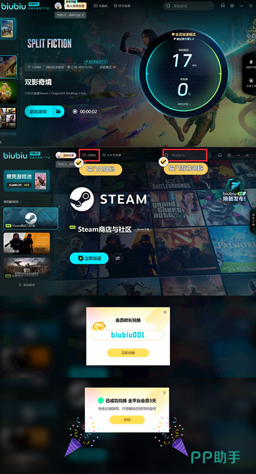 告别卡顿,迎接流畅游戏体验!现在,使用兑换码【biubiu001】,就能免费领到72小时的加速时长,省时又省心,随时随地都能享受极速网络。新注册的小伙伴也不用担心,系统直接送上3小时的加速福利,轻松开局!如果是新老玩家一同参与,叠加使用兑换码,三天满满的75小时加速时长轻松到手。加速有保障,不卡网才是真的享受。快行动吧,享受极致游戏体验从现在开始!