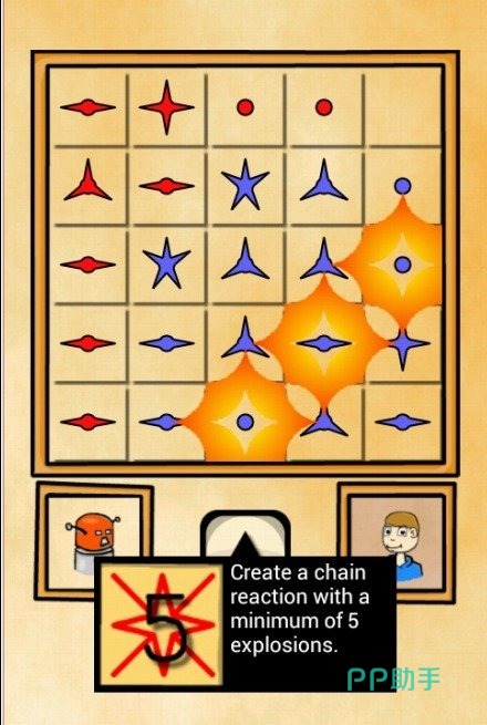 《爆炸游戏》游戏的玩法上拥有了令人刮目相看的设定,既拥有着战略回合制拉满的要素,又加入了和象棋及跳棋,如出一辙的玩法,游戏中玩家们将操控着红白两种阵营的棋子,通过深思熟虑的布局,互相之间进行克制吞噬,在棋盘的区域内加入了危险区域,会导致棋子触发炸弹,每个人都需要理清头绪,步步为营的清空对手所占据的区域。