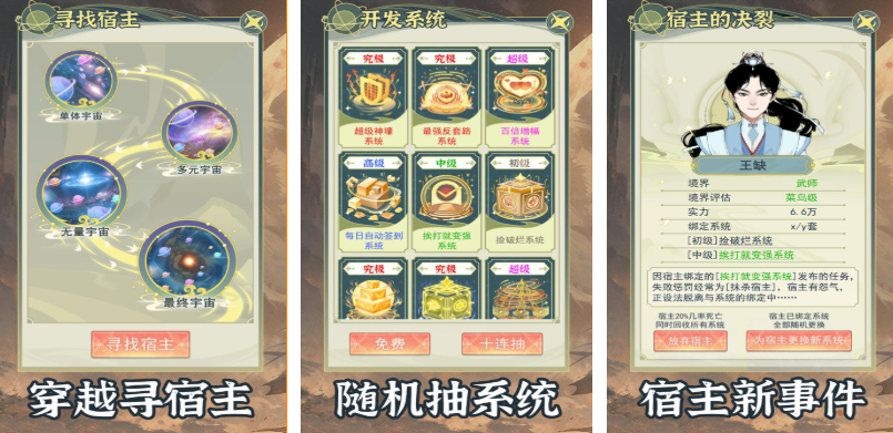 这是款能穿越到异世界自由寻找宿主的精品修真游戏,你会进入神奇的修真世界感受穿越剧的剧情,抽卡系统完全随机可获取更多属性,真实穿越的快感和修真的玩法令大家耳目一新,文字互动的操作机制极其简单能轻松上手,沉浸于穿越剧剧情中的奇妙体验代入感拉满,这款模拟了真实穿越者的神奇修真手游你不妨试试。
