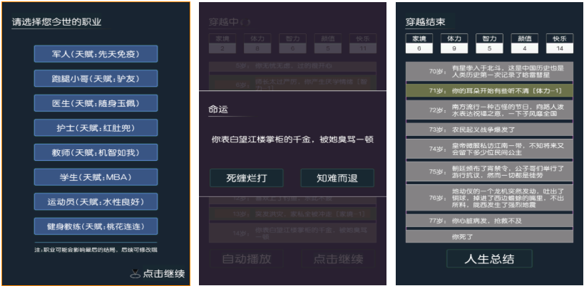 这是款文字叙述主题的古风背景穿越类游戏,你可以自由选择穿越到不同的古代朝代,并与特殊的身份与古代的角色进行交互,游戏互动性较高还融入了特殊的养成属性,古代的士兵、大夫和达官显贵等职业等你挑选,用文字与剧情、环境互动的特殊理念趣味性拉满,真实穿越回古代体验人生的感觉也无比爽快。