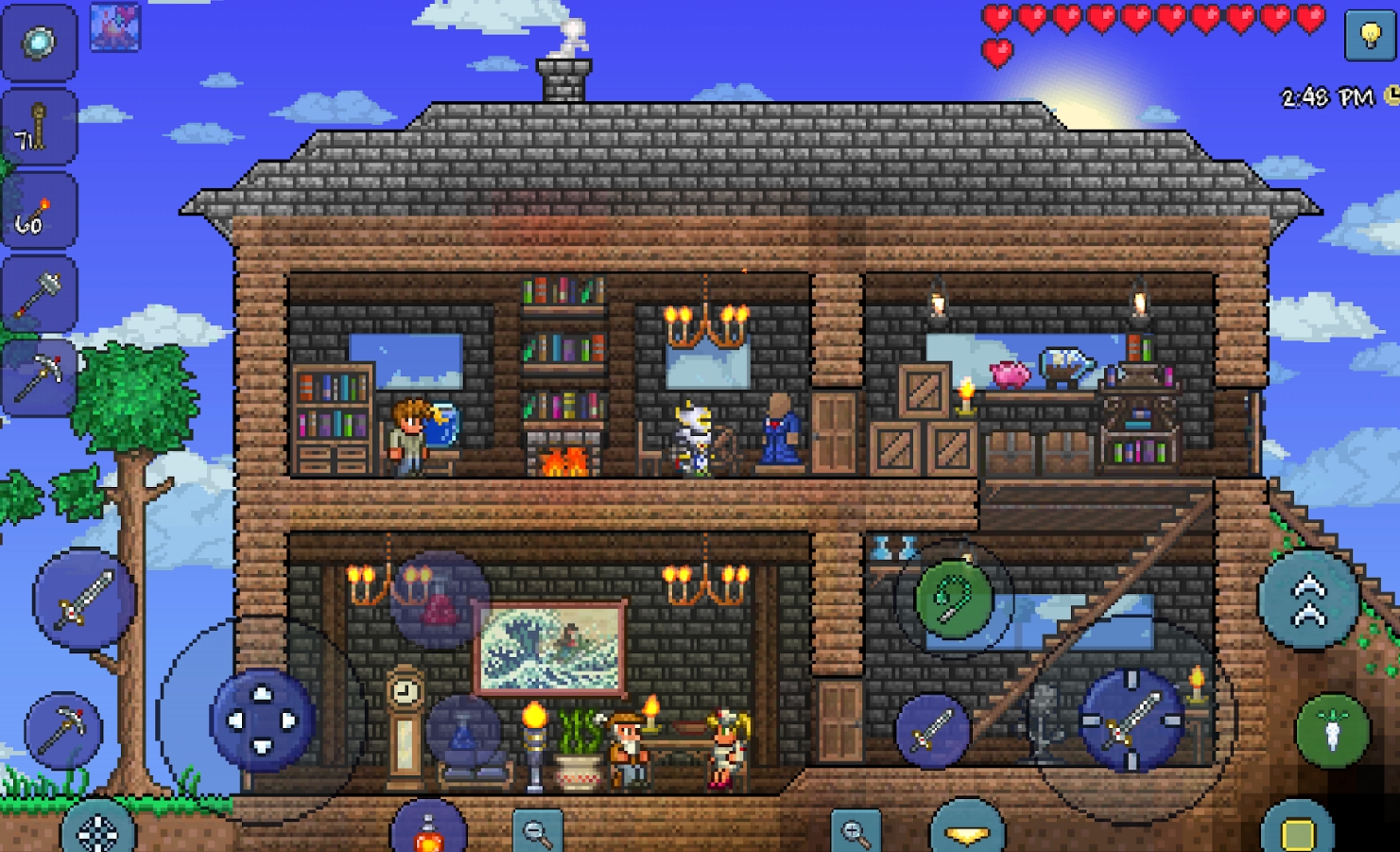 2D 横版的沙盒冒险游戏,玩家在随机生成的世界中开启冒险。在这里,你可以挖掘矿石,获取材料来制作各种工具、武器与装备;探索地下洞穴,击败怪物,寻找珍贵的宝藏与稀有物品;建造房屋,为 NPC 提供居住场所,NPC 会出售独特的物品来帮助你冒险。游戏后期还能挑战强大的 BOSS,像克苏鲁之眼、骷髅王等,每个 BOSS 都有独特的攻击方式和战斗机制,击败它们可获得强力的道具,助力玩家进一步探索世界 。