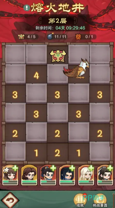 然后是熔火地井,参与需要大侠们选择6位侠客组成队伍进入,在这个玩法中藏有炸弹、宝箱和首领,点击区域地板就可以翻开,翻到炸档对队伍随机成员形成伤害,宝箱能拿到奖励,找到本层首领并完成挑战就会开启下一层。