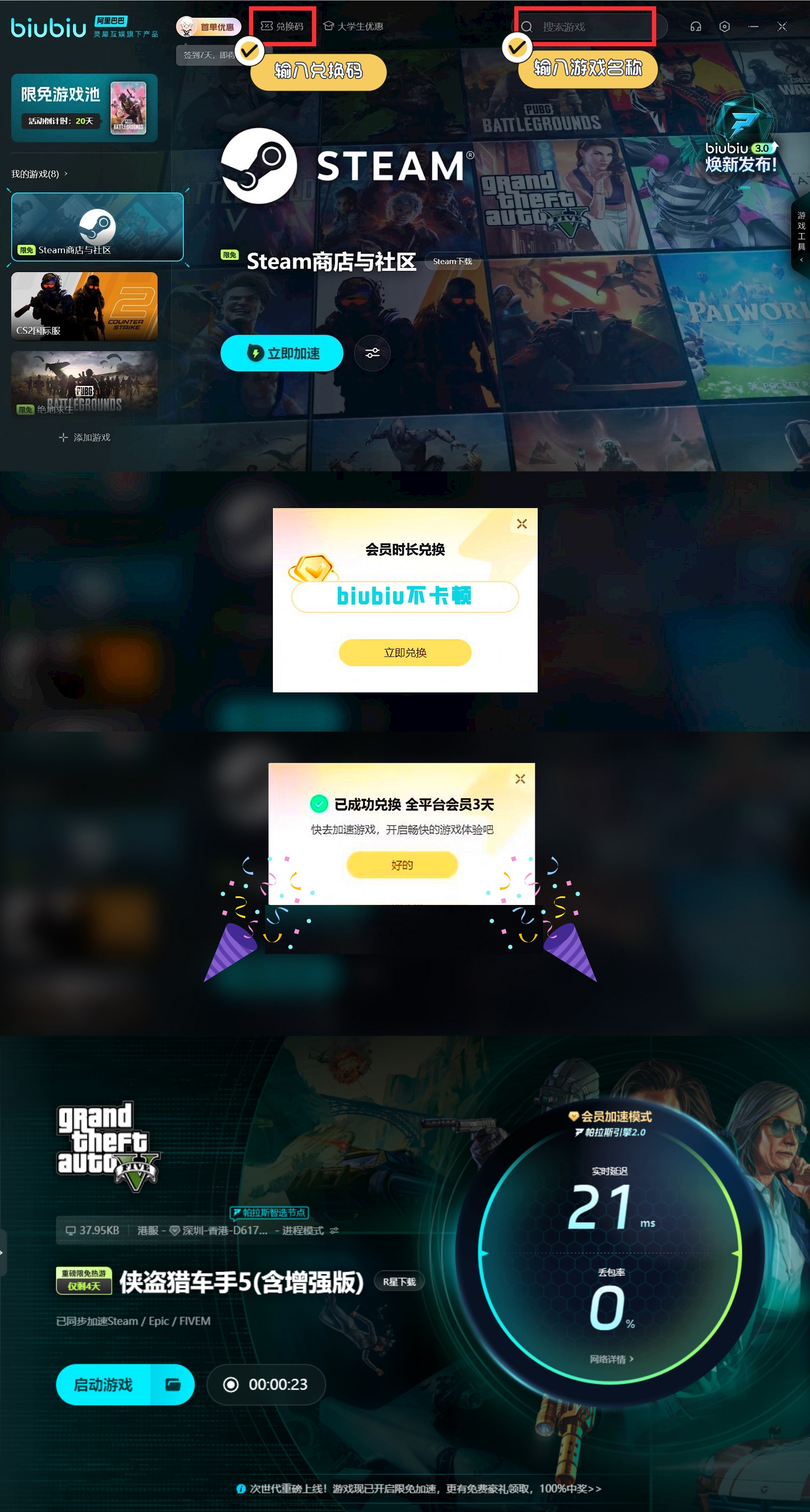 若希望享受更长时间的优质游戏体验,只需点界面上的“兑换”按钮,并输入【biubiu不卡顿】,即可领取到长达72小时加速时长,这样一来,无论是激烈的战斗还是沉浸式探索,都能在稳定且低延迟的网络环境下进行哦。