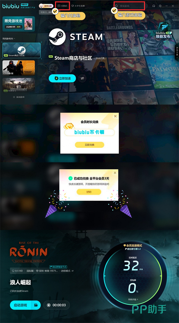 同时各位想要去解锁更多福利的朋友,到时还可在兑换界面输入“biubiu不卡顿”,这样就能领取72小时加速机会,让各位无需去充值,就能长时间体验其出色的加速性能。