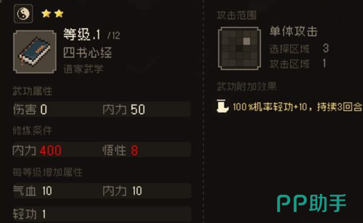 另外就是四书心经,这也是游戏里的一个奇门武学,所属的是道家武学,这个武学的修炼要求和呼吸吐纳之法一样,只不过攻击区域相对来说会更大一些,而且能提升玩家的轻功,使用之后可以连续持续三个回合,获得这个武学的话就需要去三斗坪水道,在这里会遇到一个江湖郎中,可以直接和这个郎中对话购买。