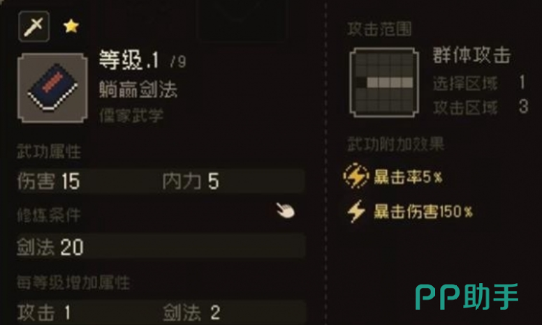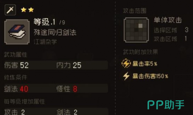 另外在江湖郎中那里还能购买四书剑法,这是一个等级相对比较高的儒家武学,玩家需要让剑法达到40,身法达到8,这样就可以顺利修炼武学,能提升暴击率和暴击伤害,对战过程中也是大范围的群体攻击。在江夏渡口酒楼这里,会涉及到主线剧情的选择,如果玩家选择的是江湖线,那就可以直接获得江湖杂学殊途同归剑法,这个剑法虽然是单体攻击,但是能带来巨大的暴击伤害。