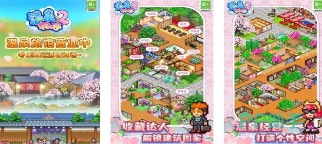 欢迎各位玩家来到像素画风的温泉旅馆。建筑图鉴数量较多,玩家可以以收藏达人的身份获取温泉旅馆。旅馆的风格相差不大,大多数以日式风格为主。在正式的温泉经营中,玩家需要打造个人私人空间,以获得更多的客源。在故事情节的推动下,玩家还可以见证许多有趣的冤种客户的故事。玩家在悠然泡澡的同时,也能获得新鲜感。