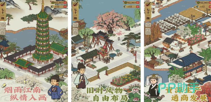 传统水墨画风较为明显,玩家将经营带有古色古香的古代城市。城市建设涉及到土地的规划以及资源的分布,玩家的责任重大。因为受季节和天气系统的影响,所以玩家需要合理规划农田种植等多个方面。除此之外,玩家还可以在剧情系统中解锁酒店老板等NPC的故事,以了解江南故事文化。