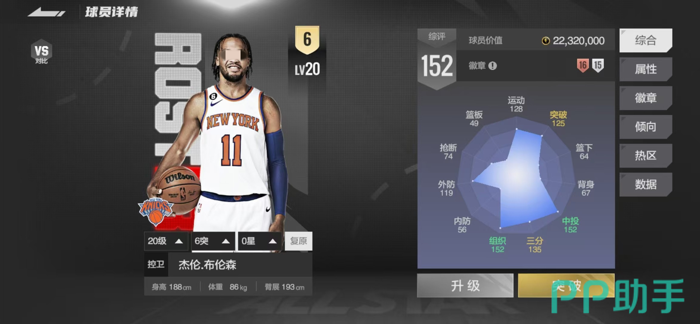 布伦森全称是杰伦布伦森,是一名很出色的控球后卫,他的身高188厘米,体重86千克,臂展193厘米,在后卫中还是属于中规中矩的模板。作为一名后卫,他的突破能力非常强,组织、三分和中投这些属性也都比较抢眼,更重要的是他拥有16枚铜徽章和15枚银徽章,在徽章方面就碾压了很多选手。徽章的分布方面,其中投射一共有12枚,组织有14枚,终结有5枚,除了防守之外,其他方面几乎都可以打出很好的效果。