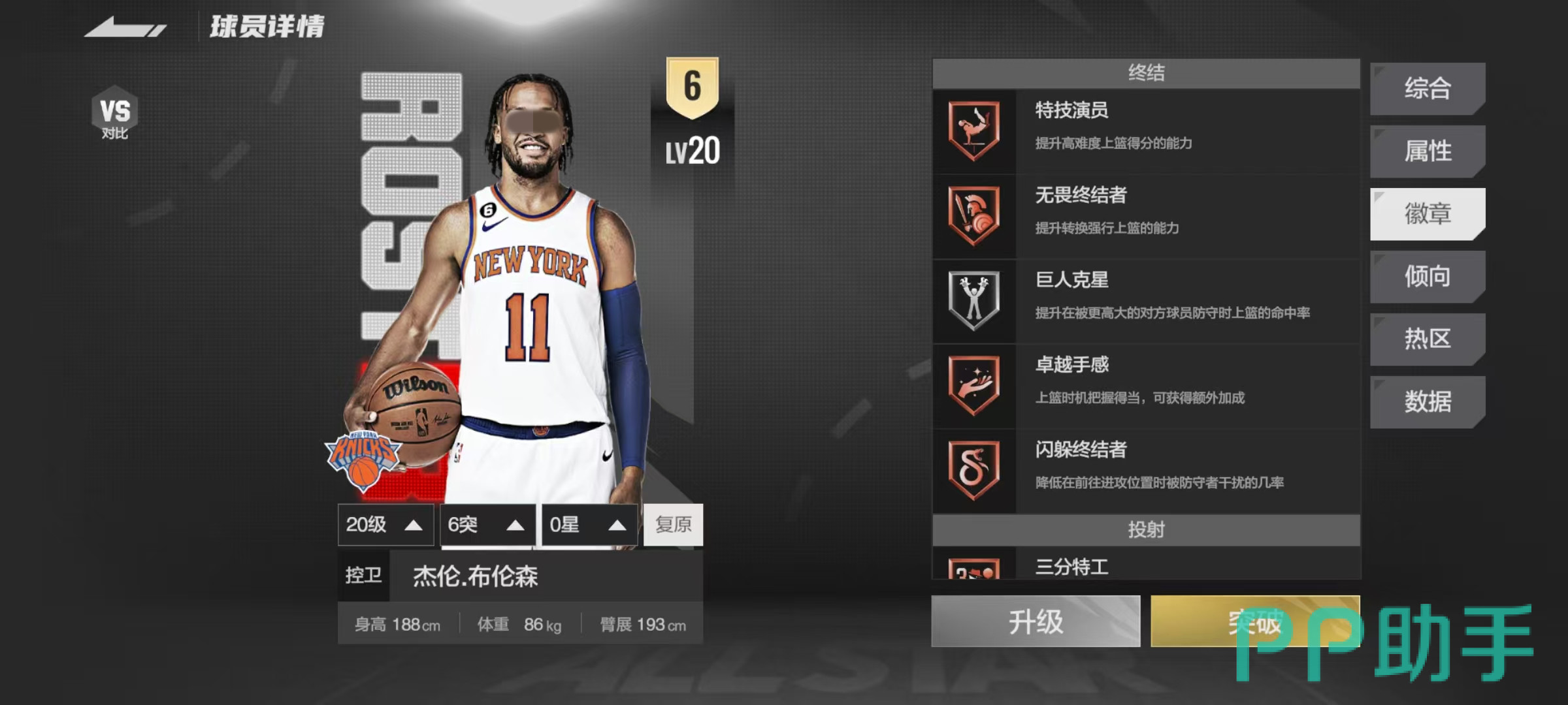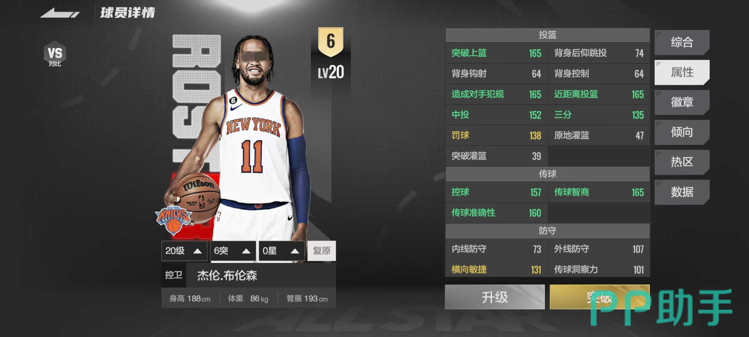 运动能力方面不错,体力165,可以在场上自由奔跑,力量82是劣势。速度131,敏捷126,这样的优势一定要发挥出来。徽章方面小编上面已经介绍过了,其中一些比较不错的徽章,包括巨人克星,提升在被高大队员防守时上篮的命中率,还有强投高手、接球投篮手、神射手等在投射方面都发挥不错。