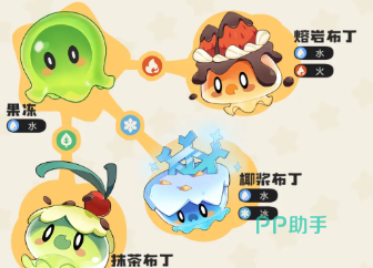 果冻拥有3个完全不同的进化形态,分别是火加水属性的熔岩布丁、水加冰属性的椰浆布丁以及水加草属性的抹茶布丁,大家在果冻的路上,可以根据自己的喜欢来让它进化成不同形态。