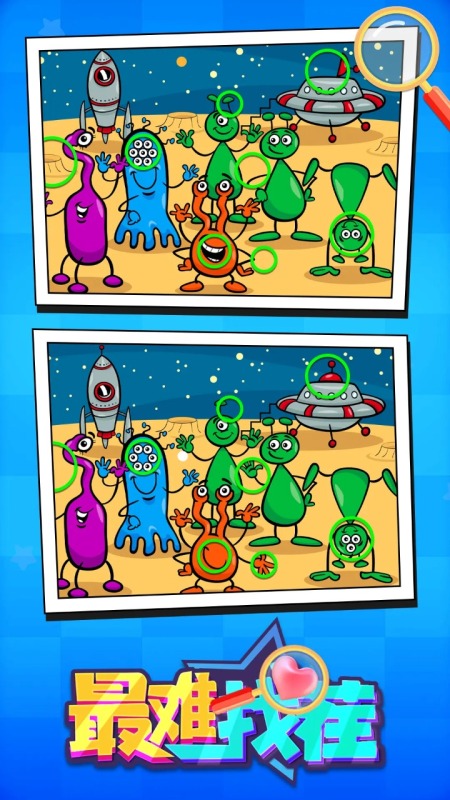 《一起来找茬》由于拥有着相对简单的操作,所以玩家基本上只进行你所看到的不同之处进行点击即可,基本上有手就能够玩,能够让玩家获取到极大的找茬游戏乐趣,并且设定的游戏关卡包含的图形以及布景,都是丰富多样的,每一次的挑战都是精彩绝伦的,而且越往下玩,越拥有着更强的新鲜感,再加上画风上面设计的特别清晰,所以视觉上的享受也是十分在线的。