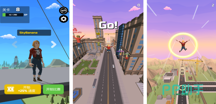 马路飞人游戏结合了火柴人的简洁风格和高空飞行的独特玩法,玩家通过点击和长按屏幕来控制角色发射绳索,使角色升空并开始摆荡,松开屏幕则让角色滑翔或下落,玩家需要控制角色接触道具来获取其效果,从而提升自己的速度、抵御障碍物的伤害等。