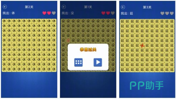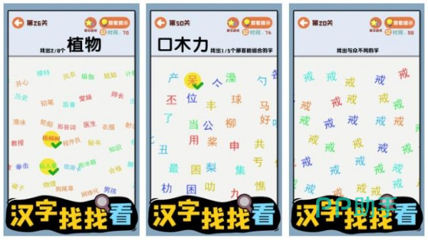 这是一款有趣的汉字主题小游戏。其中提供了非常丰富的挑战关卡,供各位尽情徜徉在文字世界里挑战竞技。《汉字找找看》的关卡主题非常奇妙有趣,例如在画面中会出现极度类似的两个字,各位需要在一群“戒”中找出唯一不同的“戎”的。或是在各种汉字中,到处带有指定部首的字。其乐无穷充满挑战的找字闯关游戏,一定能够带给大家无限快乐。