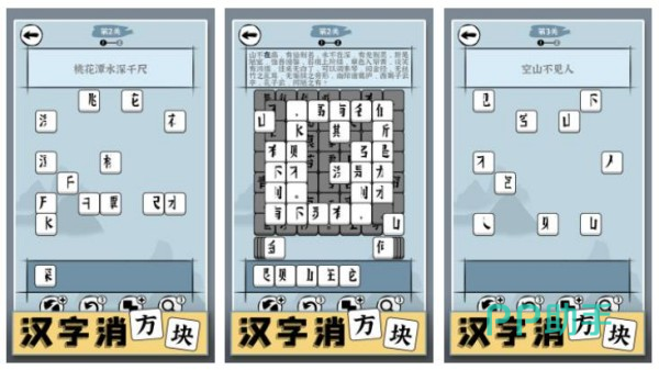 此游戏以经典的古诗词为元素,为大家在各个关卡中提供了汉字的拆分方块,例如“桃”字便被分为了“木”和“兆”,玩家需要根据题面的的诗词,从众多带有汉字部首的小方块中,组合出诗词中的完整汉字。《汉字消方块》的每一个关卡就是一首有趣的古诗词,伴随着关卡的深入,从一句词变为一首词,充满了挑战和考验。