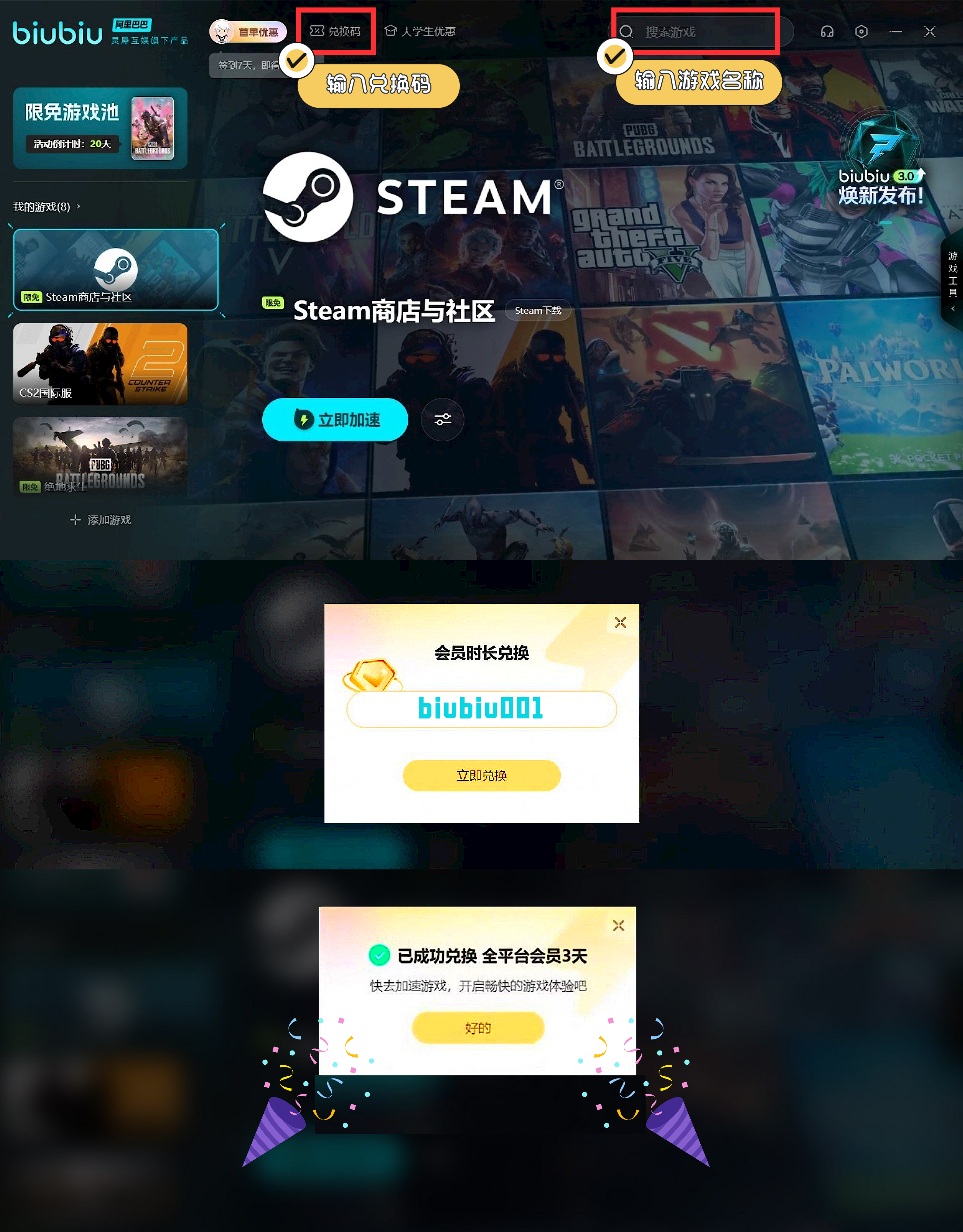 但下载这些游戏不想要浪费太多的时间等待,还可以选择一款加速器。biubiu加速器这一个加速器就可以保证下载的速度,避免网络的卡顿,现在还可以领取免费加速时长。新用户首次注册免费3小时,还可以叠加通用兑换码【biubiu001】领取一个72小时的加速时长,这两个免费加速时长还可以叠加使用,一共免费长达75小时。