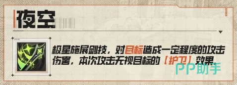 极星是一名综合型近战职业角色,他不仅具备一定的输出能力,能够在战斗中对敌人造成可观的伤害,还拥有出色的机动能力,可以在战场上灵活穿梭,同时,他还拥有专属的远程攻击手段,这使得他在面对不同战斗局势时能够更加从容地应对,极星的技能当中第一个基础技能叫做夜空,当极星施展这一技能时,他会展现出精湛的剑术技巧,他以极快的速度挥舞手中的武器,对目标造成一定程度的攻击伤害,而且本次攻击还具有一个特殊的效果,那就是无视目标的护卫效果,这意味着无论目标有多少防御手段,极星的攻击都能够有效地突破防线。