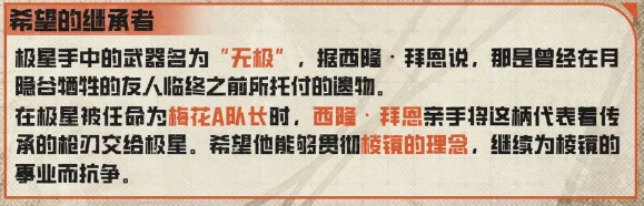 极星不仅仅是游戏中的男主角,更是一个充满魅力与故事的神秘角色,他的外观设充满了科技感与机甲风格,脚踩着一双具有机甲特色的锋利刀片,作为棱镜梅花 A 队的队长,极星肩负着重大的责任与使命,他加入了反抗者组织棱镜,成为了其中不可或缺的一员,极星手中的武器名为无极,这把武器可有着非凡的来历,它曾是在月隐台牺牲的友人临终之前所托付的遗物。