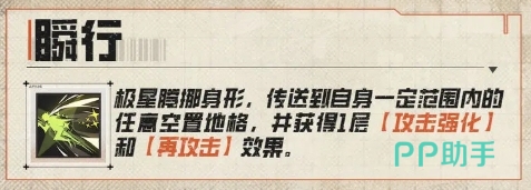 第二个基础技能是瞬行,当极星启动这个技能时,他会瞬间如同闪电一般快速传送到自身一定范围内的任意空置地格,这一技能不仅让极星在战斗中能够迅速调整位置,躲避敌人的攻击,还能在关键时刻给予敌人出其不意的打击,并且使用瞬行技能后,极星还会获得1层攻主强化和再攻击效果,攻主强化可以提升他下一次攻击的威力,而再攻击效果则允许他在一次攻击后有机会再次发起攻击,增强了他的输出能力。