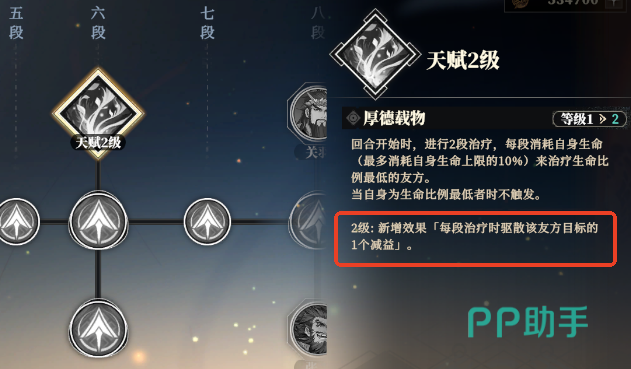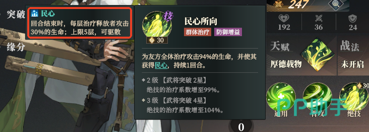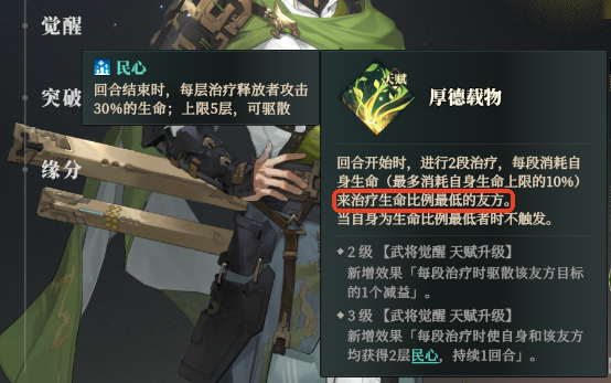 天赋“厚德载物”,每回合开始可以进行2段治疗,每一段会消耗自身血量,来治疗己方血量比例最低的队友。如果自身是血量比例最低的则不会触发该效果。觉醒后更是可以在治疗的时候驱散1个减益并为自身以及目标增添2层民心buff。