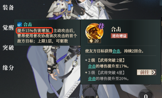 曹昂的绝技“合击”则是可以指定友获取2回合的合击效果,队友获得15%的伤害增益,并且主动攻击后曹昂也会用普攻协助攻击一次该目标。升星可以提升合击伤害,最多提高至20%,可以给队伍中的厉害的输出型武将提供合击buff为其增伤。