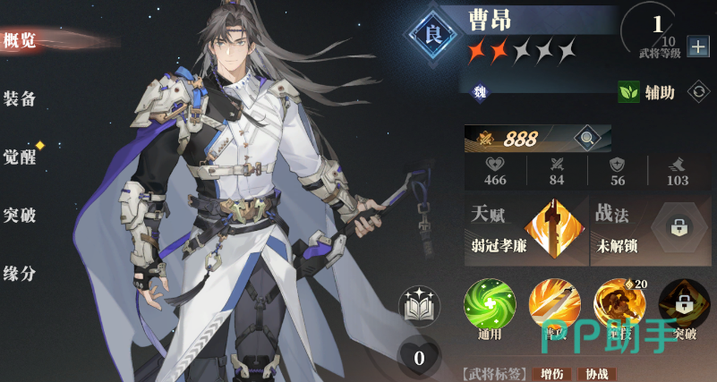曹昂的天赋则是每普攻4次给全队增伤10%,持续2回合,通过武将觉醒可以降低门槛,最低只需2次普攻就可以为队伍提供该增益。