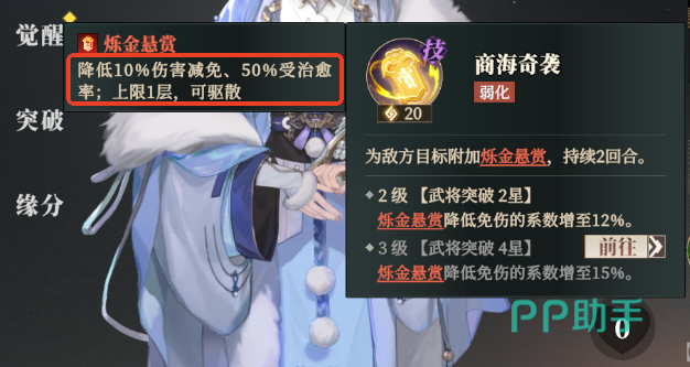丁夏的天赋也是队友在对受到“商海奇袭”绝技debuff影响的敌人攻击时,丁夏会对该目标额外造成一定的法术伤害。突破技“筹算乾坤”,每造成3次直接或者间接伤害,可以额外提供70%(100%)的增伤。