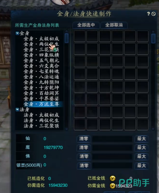 如果你还想换取法身,那就去找左边的小孩同样进行任务接取,按照相同的流程去做就可以。别忘了,金身和法身的效果可是各有千秋,选好你要的那一个。最后一步,就是制作金身了。兑换完配方之后,进入自己的生产界面,开始按照系统的要求制作金身。这个过程大约需要4小时左右,玩家们可不要急躁,等到时间一到,你就能看到你努力的成果。值得注意的是,金身的制作难度会随着角色等级提升逐渐增大,所以刚开始可以先从5级做起,慢慢累金叶子,再往6级、7级推进。