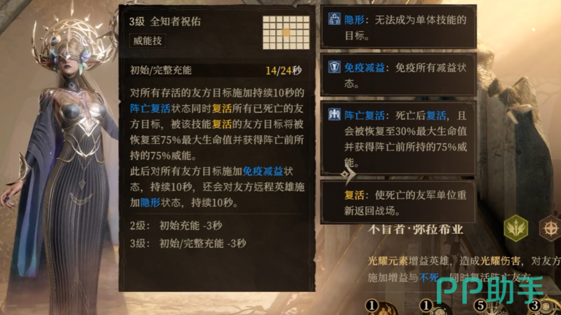 不仅如此,被盲女增加不死效果的队友,还能够免疫所有减益效果,附加隐身状态,处于隐身效果的期间,队友可以免疫一些需要显身的伤害。