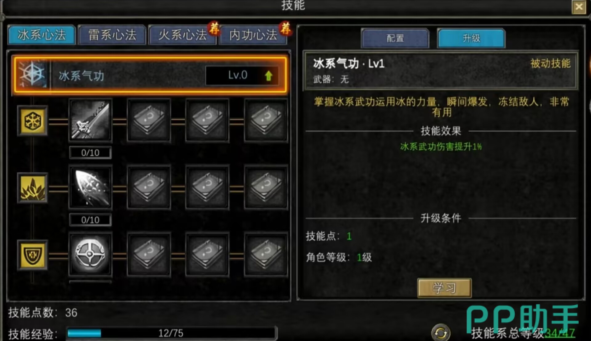 气功技能也是分三种元素术法和内功心法,冰系的有冰系小刀、火系的有火系大刀、雷系的有雷系长枪、内心功法有生生不息等等。每一个技能包含不同心法,效果也不一样。例如冰系小刀有冰心诀、寒气逼人等等心法,冰心诀可以增加冰属性防御,寒冰决则是在战斗时能大大增强冰冻敌人的概率。