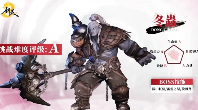 冬虫的真实强度偏高,建议玩家在挑战前,将自身攻击和防御属性尽量堆到400以上,玩家可提前服用秘药,短暂提升属性,为战斗增添胜算,冬虫的技能需要详细了解才能够更好的战斗,拔山扛鼎技能使用后冬虫将斧子举过头顶蓄力,此时其头顶会出现醒目的“危”字,同时地面出现三层黄圈,这一技能斧子砸地后会附带焰火伤害,玩家一旦中招,不仅会遭受一次性高额伤害,还会持续扣血。