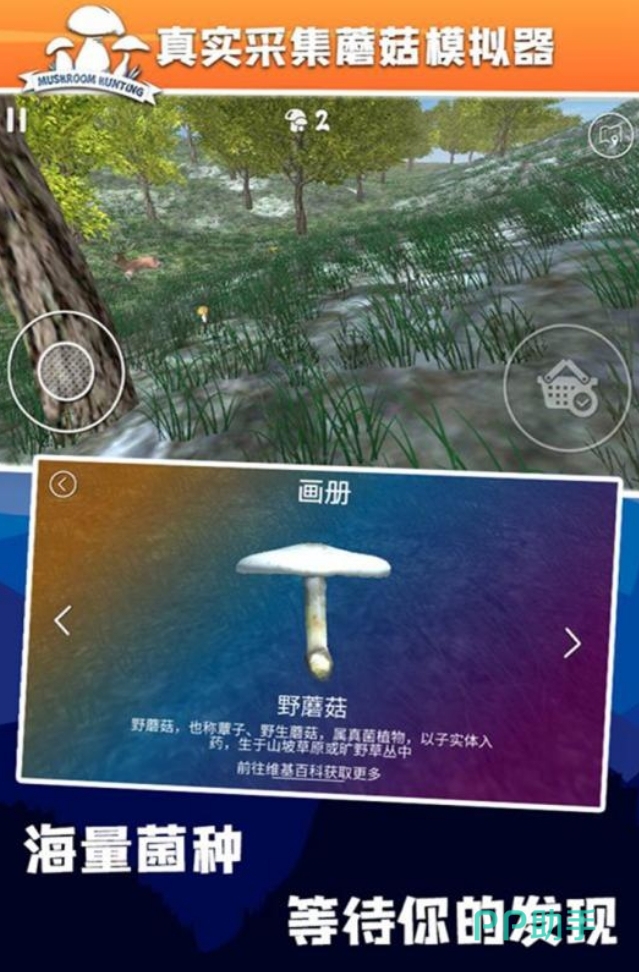 各位可通过这部游戏前往野外进行采蘑菇模拟玩法,它有一个很真实的3D世界,每个地区的场景也都搭建得很生动,同时还收录了多种不同的蘑菇可供人们进行采集。玩家们可在地图里四处搜索,寻找蘑菇的踪迹。每次采集到蘑菇后,游戏都会给出该蘑菇的介绍而高清图片,方便玩家们去了解这些蘑菇的特性,往后再见到时就更容易认出它们。