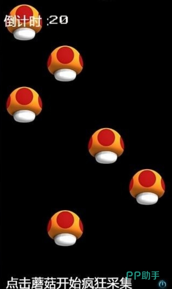 在倒计时结束前尽可能地采集更多的蘑菇吧。游戏会在屏幕里各位置随机生成多个不同的蘑菇,点击后会立刻消失并计入得分,同时还会在新位置再次完成蘑菇的生存,各位要做的就不断地去点击屏幕,通过采蘑菇的方式不断地累积得分。这部游戏每局只有20秒的采集时间,时间一到就会立刻结束,各位可来它这里挑战下自己的手速。