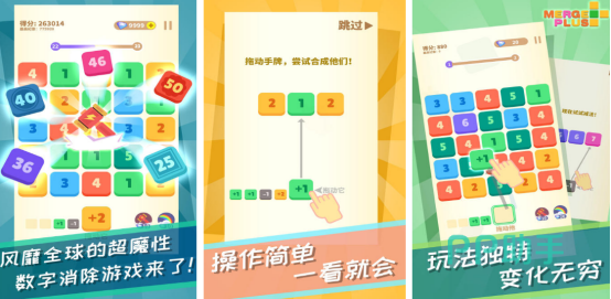 简单的操作方式,对于年龄段没有任何的要求,开局后玩家会看到各种带有颜色以及带有不同数字的方块,玩家要通过仔细思考,将三个或多个相同色块放在一起,就能完成合并的任务,合并的数字越多,那么获得的分数就会越高。其中还有很多清除的道具以及删除的道具,可让玩家随意使用,关卡的难度也会随之增加,玩家可以在这里挑战最高分。