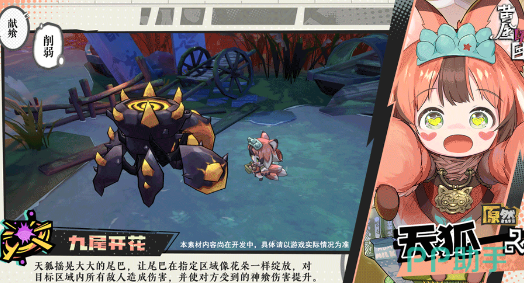 九尾开花时一个可以可以削弱敌人能力的技能,释放该技能后,天狐的尾巴会在指定的区域内想花一样绽放,只要在自己的目标区内内,敌人都会受到攻击,而且该技能还削弱敌人的战斗能力。