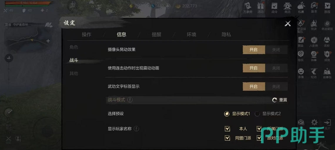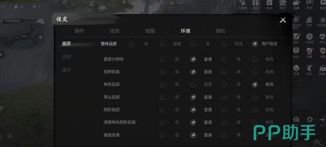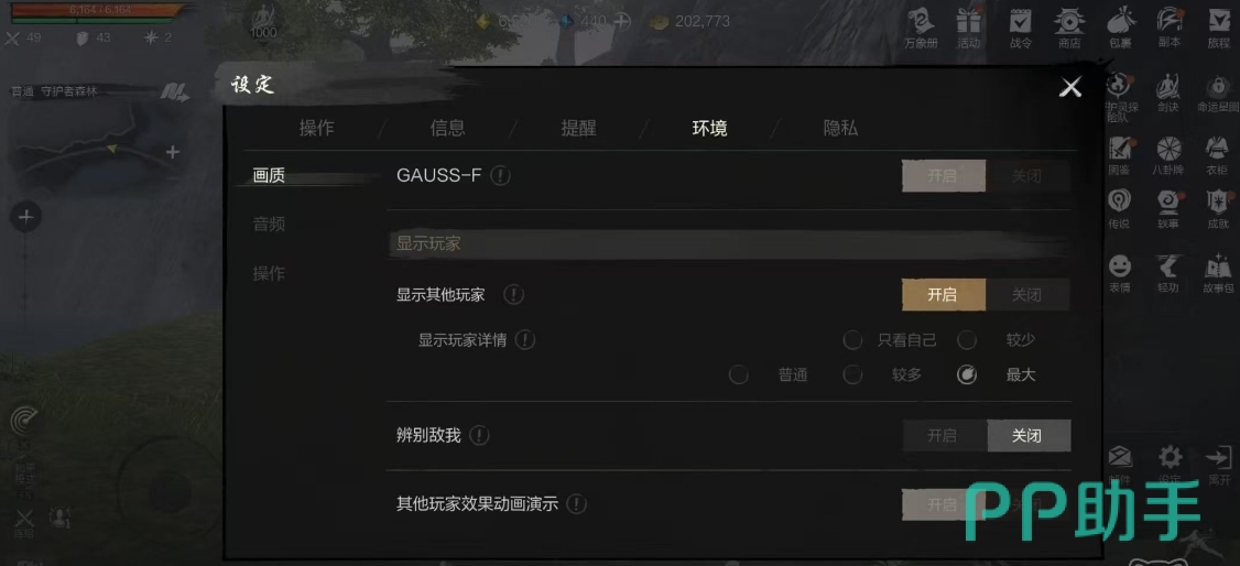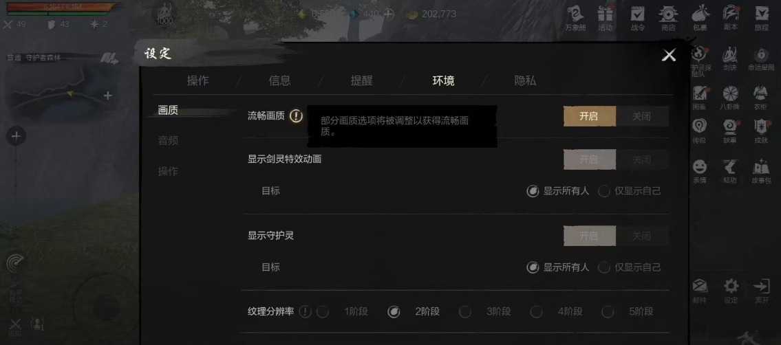 在设置页面上的显示剑灵和守护灵的特效动画没什么用,小编建议直接关闭。还有纹理分辨率、品质整体、视野距离、草丛显示、角色品质显示等与战斗体验没有关系的,全部调到最低层次,这样可以把对游戏流畅度的影响降到最低。