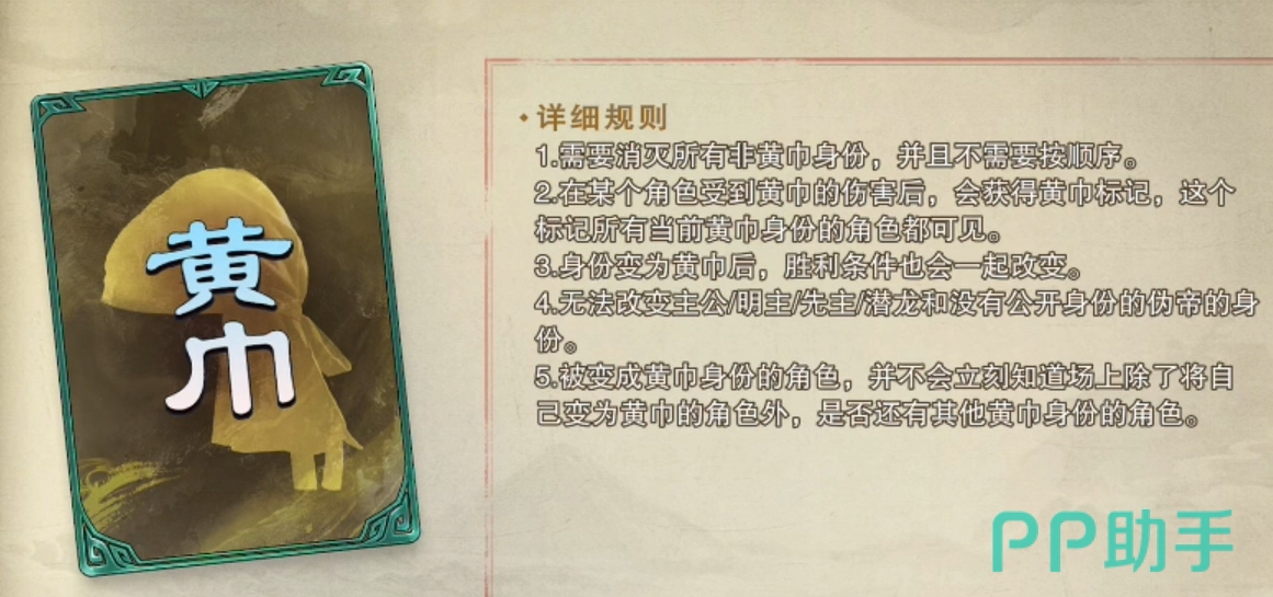 黄巾:玩法类似内奸,但它可将在对某玩家造成三点伤害,将其也变成黄巾,但不能将主公类、伪帝的身份牌变成黄巾。