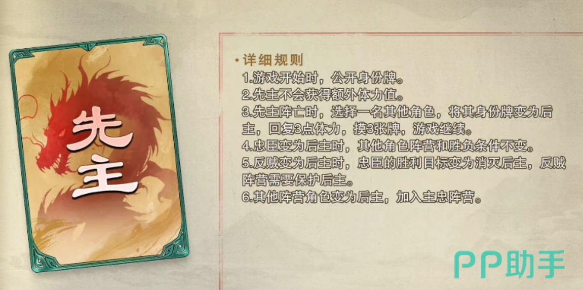 先主:被淘汰后游戏继续,同时它会指定一位玩家成为主公。