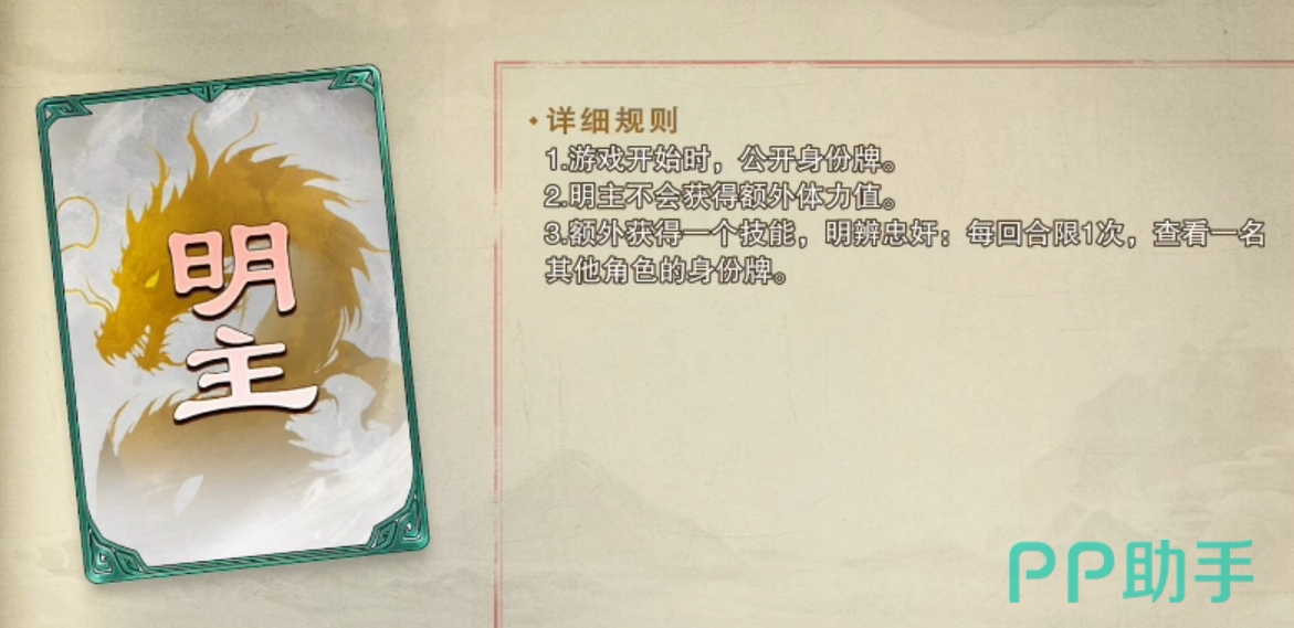 盟主:反贼阵营里的特殊身份,可主动亮出技能让任意角色额外摸两张,亮明身份时阵亡则反贼阵营会直接失败。