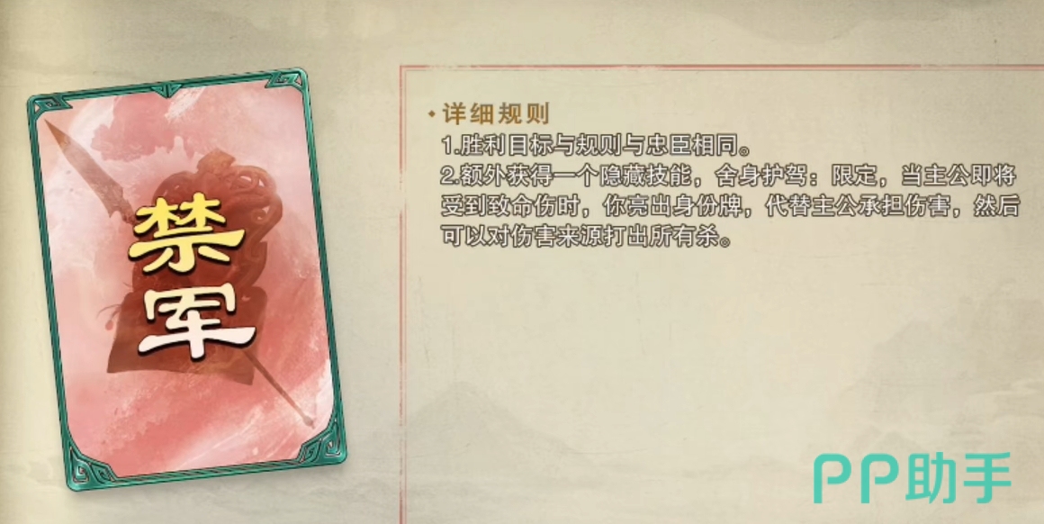 禁军:定位类似于坦克,可在主公濒死时挡刀,并能将手里的杀一次性全部打向伤害来源。