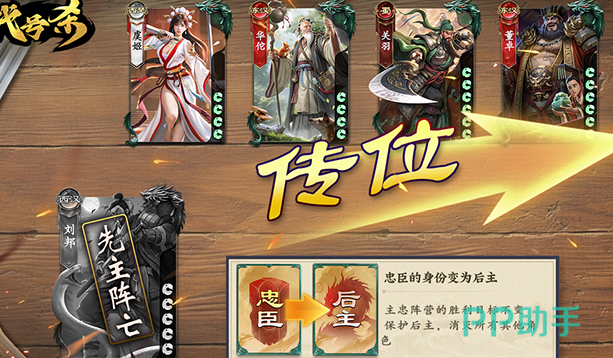 卡牌类型分成身份牌还有武将牌。身份牌总共有16种不同的身份,部分的身份还会有一些专属的技能。每一个武将还会有独特的技能,例如周瑜有火烧赤壁,刘备有以德服人。玩家可以通过使用武将牌,然后去参与战斗,可以有效发挥技能的优势。